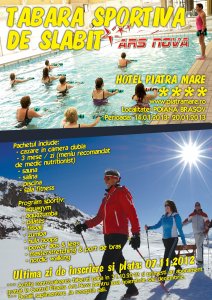 Tabara de slabit, cu durata de o saptamana, va fi organizata de Ars Nova la Hotel Piatra Mare, din Poiana Brasov. Perioada a fost special aleasa 14.01.2013- 20.01.2013, in primul rand pentru a-i ajuta pe participanti sa intre in forma dupa sarbatori si in al doilea rand pentru ca sunt sanse mari ca acestia sa se bucure de o vreme excelenta, cu zapada si peisaje de poveste.