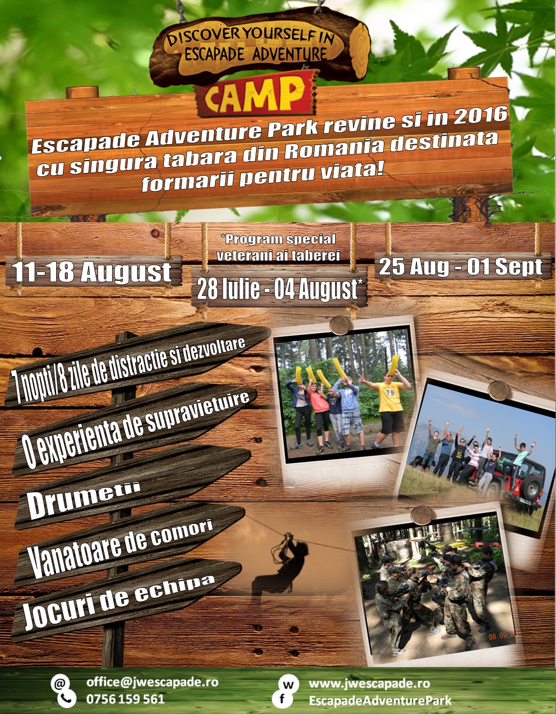 Escapade Adventure Park revine și în 2016 cu singura Tabără de Formare pentru Viață - "Discover Yourself in Escapade Adventure". Tabăra se adresează adolescenților cu vârste cuprinse între 14 și 18 ani.