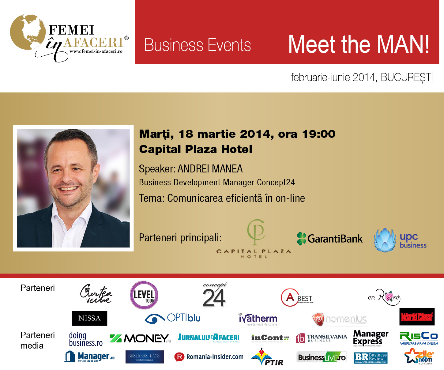 ANDREI MANEA, Business Development Manager Concept24, este speakerul evenimentului Meet the MAN! Bucuresti, ce va avea loc marti, 18 martie 2014, ora 19:00, la Capital Plaza Hotel, si va dicuta cu participantele despre comunicarea eficienta in on-line. „Oricine este implicat intr-o afacere stie cat este de importanta prezenta in on-line. Si nu doar prezenta, ci […]