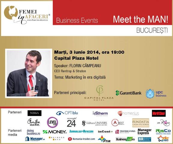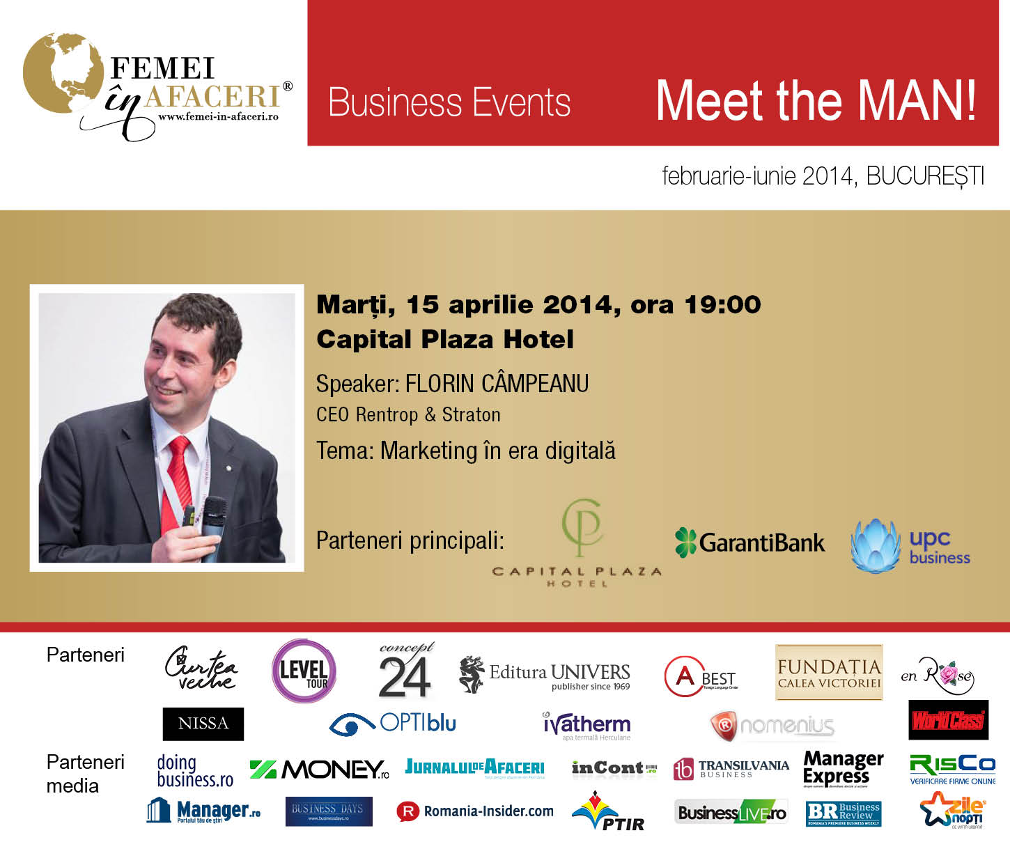 Florin Campeanu, CEO Rentrop & Straton, este speakerul evenimentului Meet the MAN!, organizat de Femei in Afaceri in București, marti, 15 aprilie 2014, ora 19:00, la Capital Plaza Hotel. Tema evenimentului va fi Marketingul in era digitala. „Traversam o perioada in care aproape totul se intampla in mediul online. De aceea, am ales impreuna cu […]