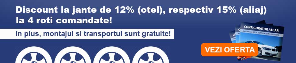 Cumpara acum 4 roti complete si beneficiezi de discount de 12% la jante otel sau 15% la jante aliaj. Cum beneficiezi de discount pentru roti complete? Alegeti din configuratorul de mai jos 4 jante aliaj sau otel si anvelope Rovelo, Falken, Nexen, Kumho, Sailun, Zetum-by-Kumho Avantaje: - 12% discount la jantele din otel - 15% […]