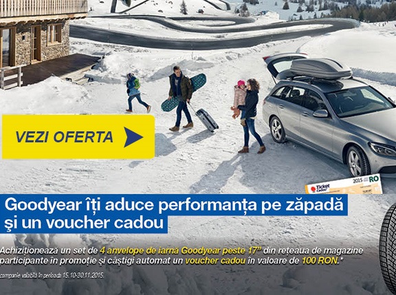 Durata promotiei: 15.10 - 30.11 2015 Cum beneficiezi de Voucherul Cadou? 1. Cumperi 4 anvelope iarna Goodyear de la AnveloSHOP cu R>=17 , din categoriile Turisme, 4x4/SUV 2. Completeaza datele tale in sectiunea aferenta din siteul promotie.goodyear.eu. Toate campurile sunt obligatorii, inclusiv incarcarea copiei facturii. 3. Primesti automat un Voucher Ticket Cadou Edenred de 100 […]
