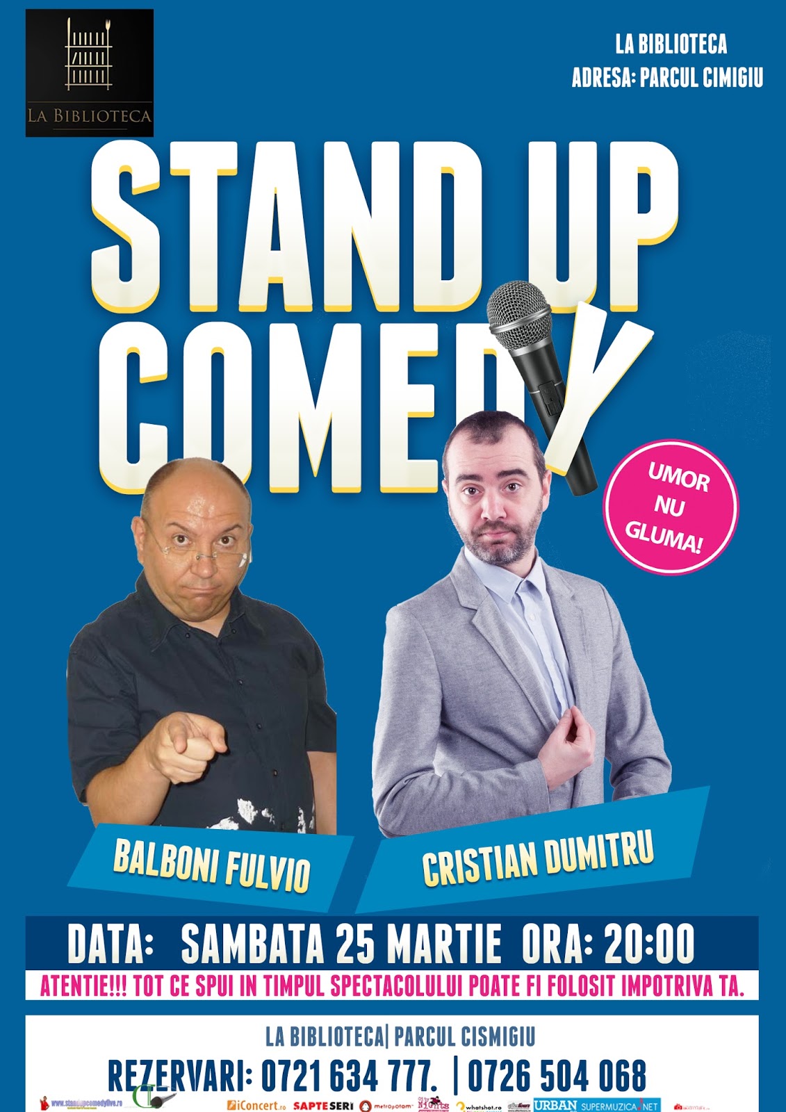 Stand-Up Comedy Sambata 25 Martie Bucuresti @ La Biblioteca La Biblioteca te invita din nou la Stand-up Comedy. Vino sambata, 25 martie incepand cu ora 20 sa vezi un show plin de umor nu gluma. Te vor distra Balboni Fulvio si Cristian Dumitru. Rezervari & info: 0721 634 777. | 0726 504 068 ATENTIE! LOCURILE […]