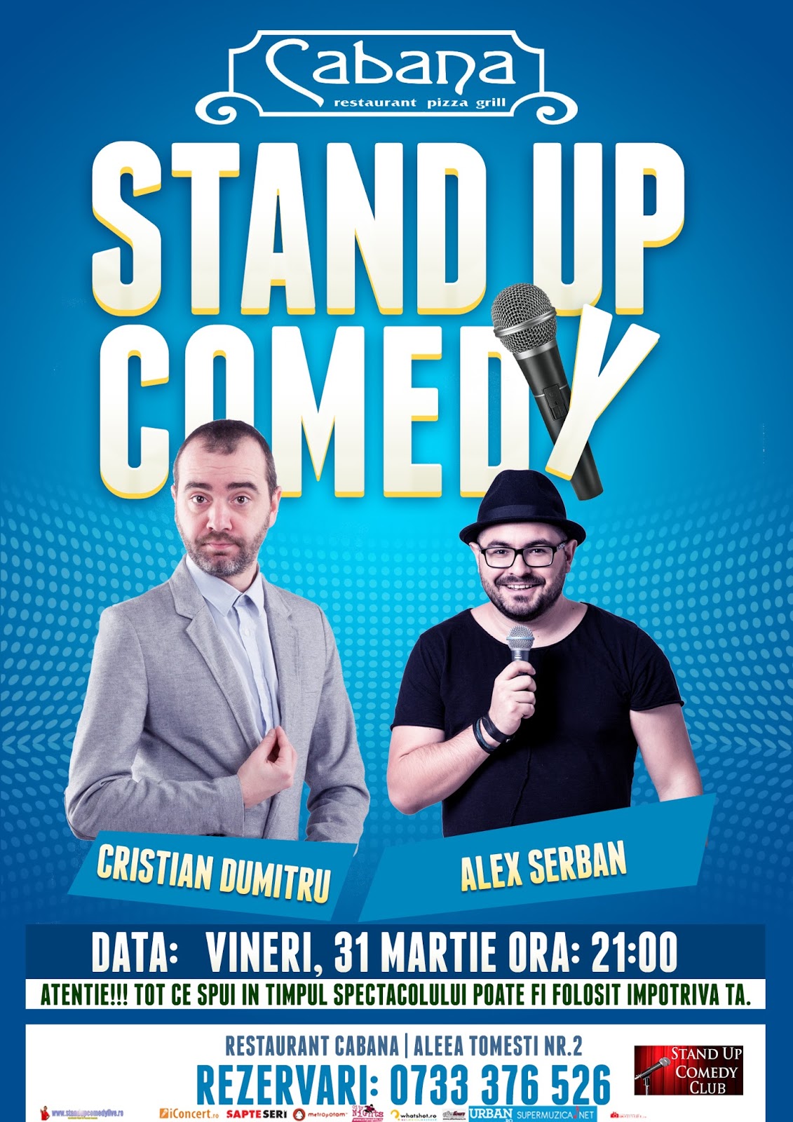 Stand-Up Comedy Vineri 31 Martie Bucuresti Vineri, 31 martie, Cristian Dumitru si Alex Serban te invita la restarant “La Cabana” pentru a vedea un show de stand-up comedy. Vor fi multe glume bune si promit sa te faca sa razi cu lacrimi. REZERVARI LA: 0733.376.526 Cine sunt ei: Alex Serban, este un tanar comediant grasut, […]