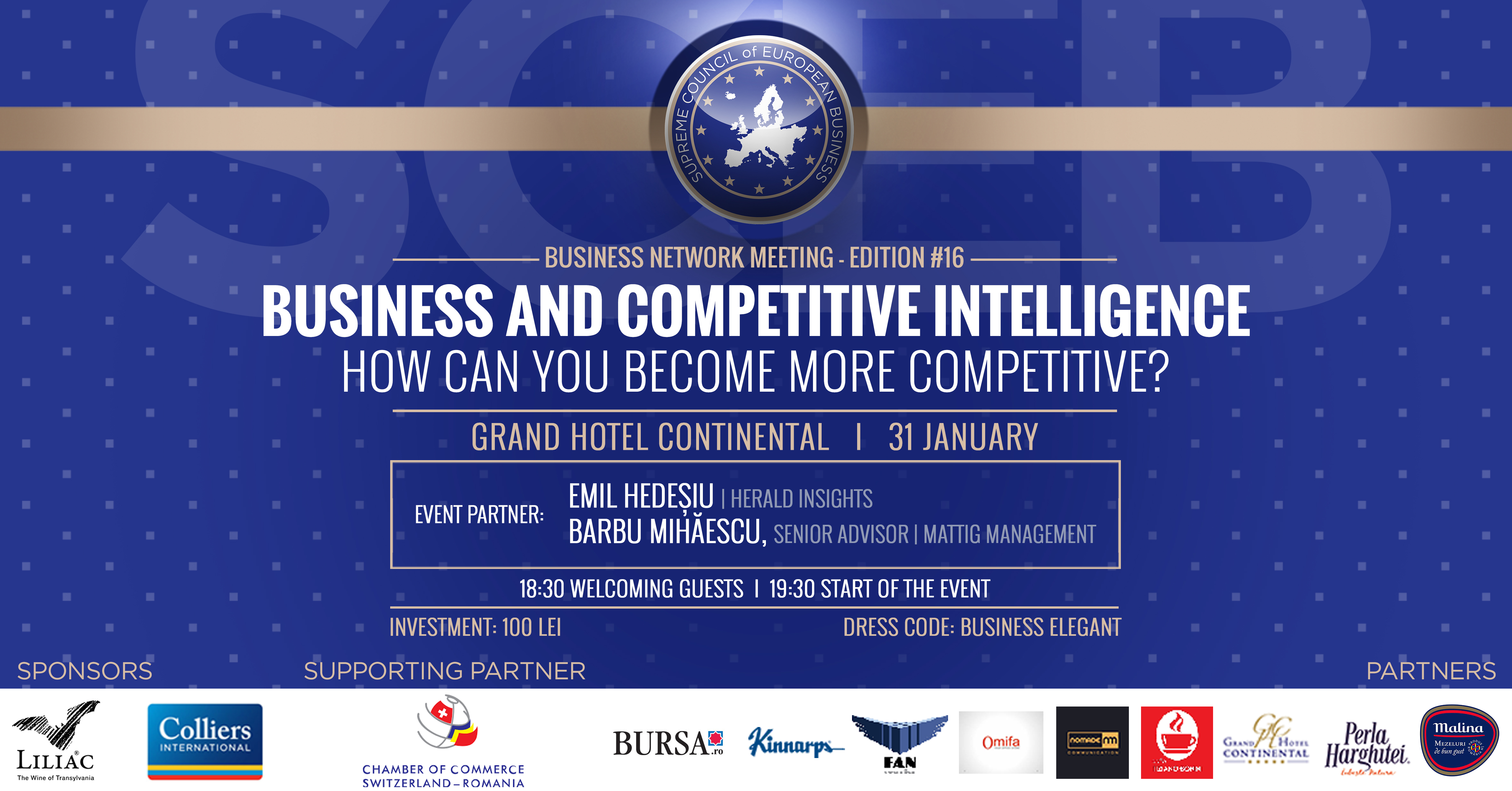 Supreme Council of European Business a organizat în data de 31 ianuarie 2020 primul eveniment de afaceri din acest an, la Grand Hotel Continental. Întâlnirea a avut ca principale puncte de discuție Business & Competitive Intelligence și modul în care aceste două instrumente cresc eficiența deciziilor de business. Gradul de competitivitate al unui business rezultă […]