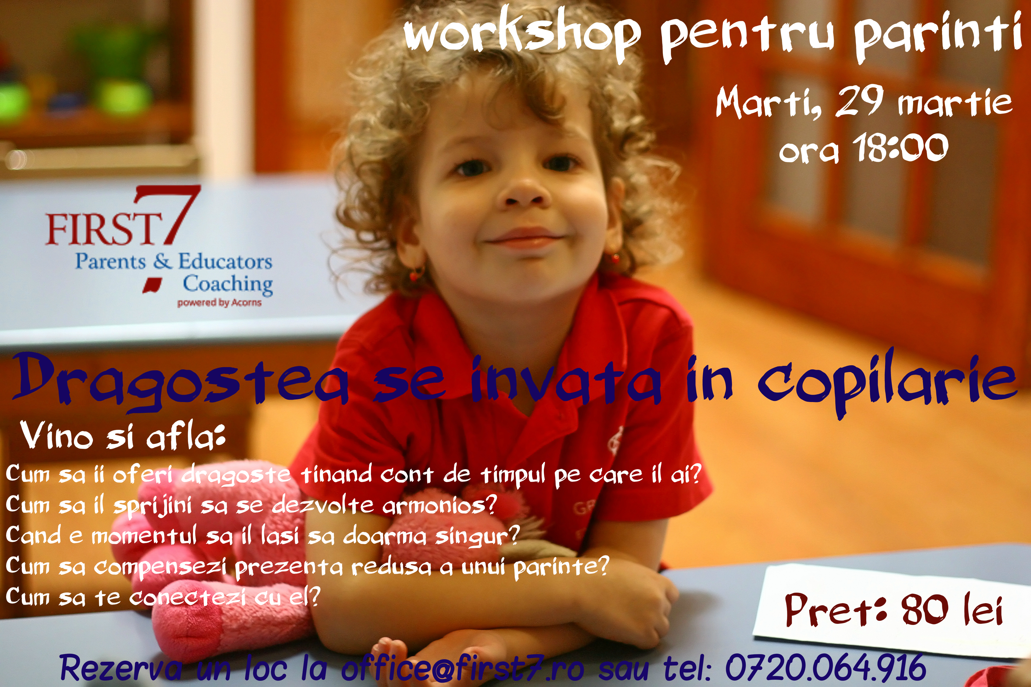 Workshop pentru parinti Va invitam si va asteptam sa participati la Dragostea se invata in copilarie! FIRST7 organizeaza un workshop special pentru parinti care isi propune sa ofere o perspectiva de specialitate, valoroasa, ajutandu-i pe parinti cu strategii, cum se pot implica si cum le pot sustine. Cui se adreseaza? Workshop-ul facilitat de FIRST7 se […]