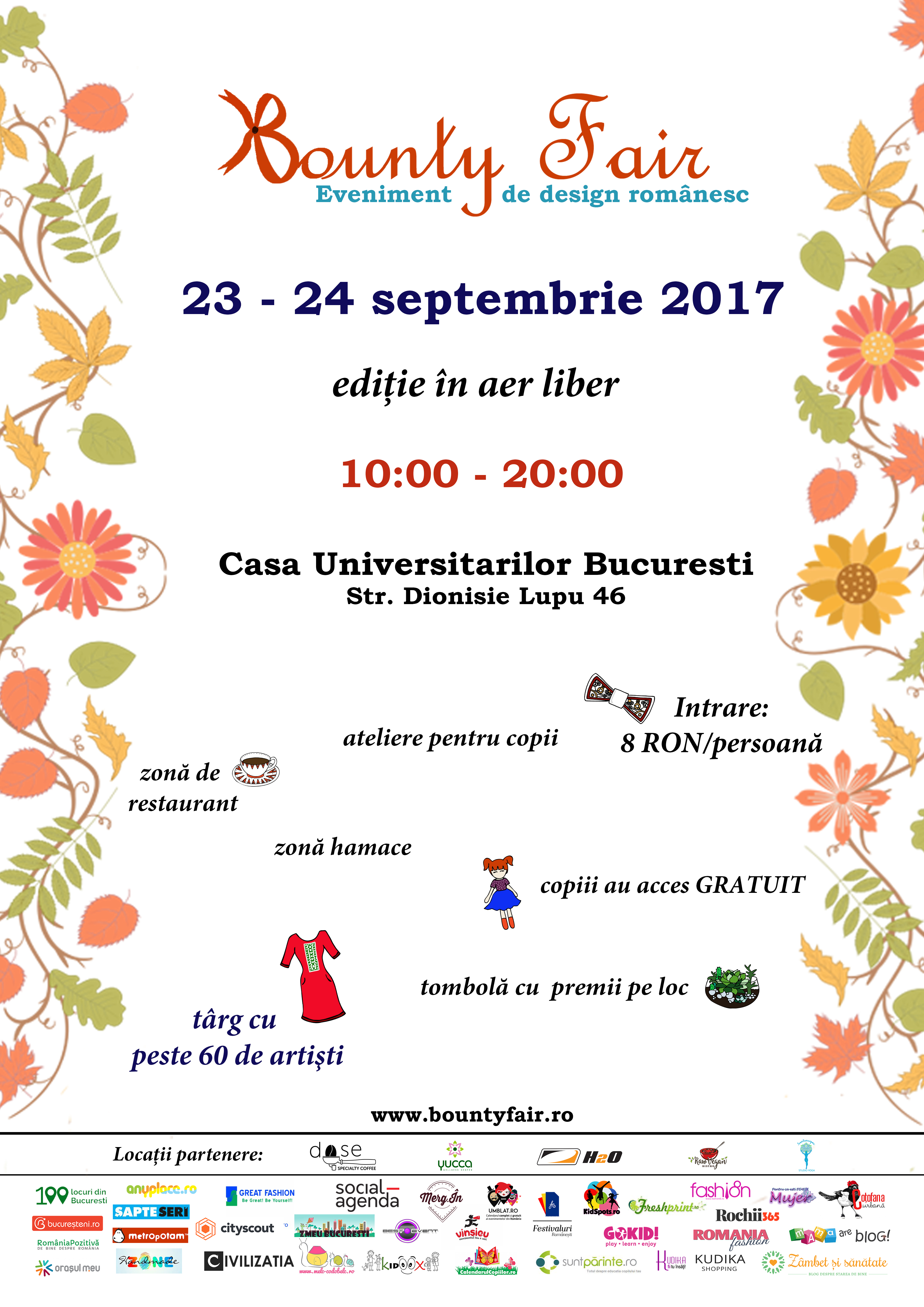 Bounty Fair, ediţia de Ziua Femeii, va avea loc în weekendul 4-5 martie 2017, la Casa Universitarilor Bucureşti. Programul de la orele 10:00 pȃnă la 19:00, ȋn ambele zile. Accesul se face pe bază de bilet, ȋn valoare de 8 lei de persoană, iar copiii pȃnă ȋn 14 ani au intrarea gratuită. Biletul include accesul […]