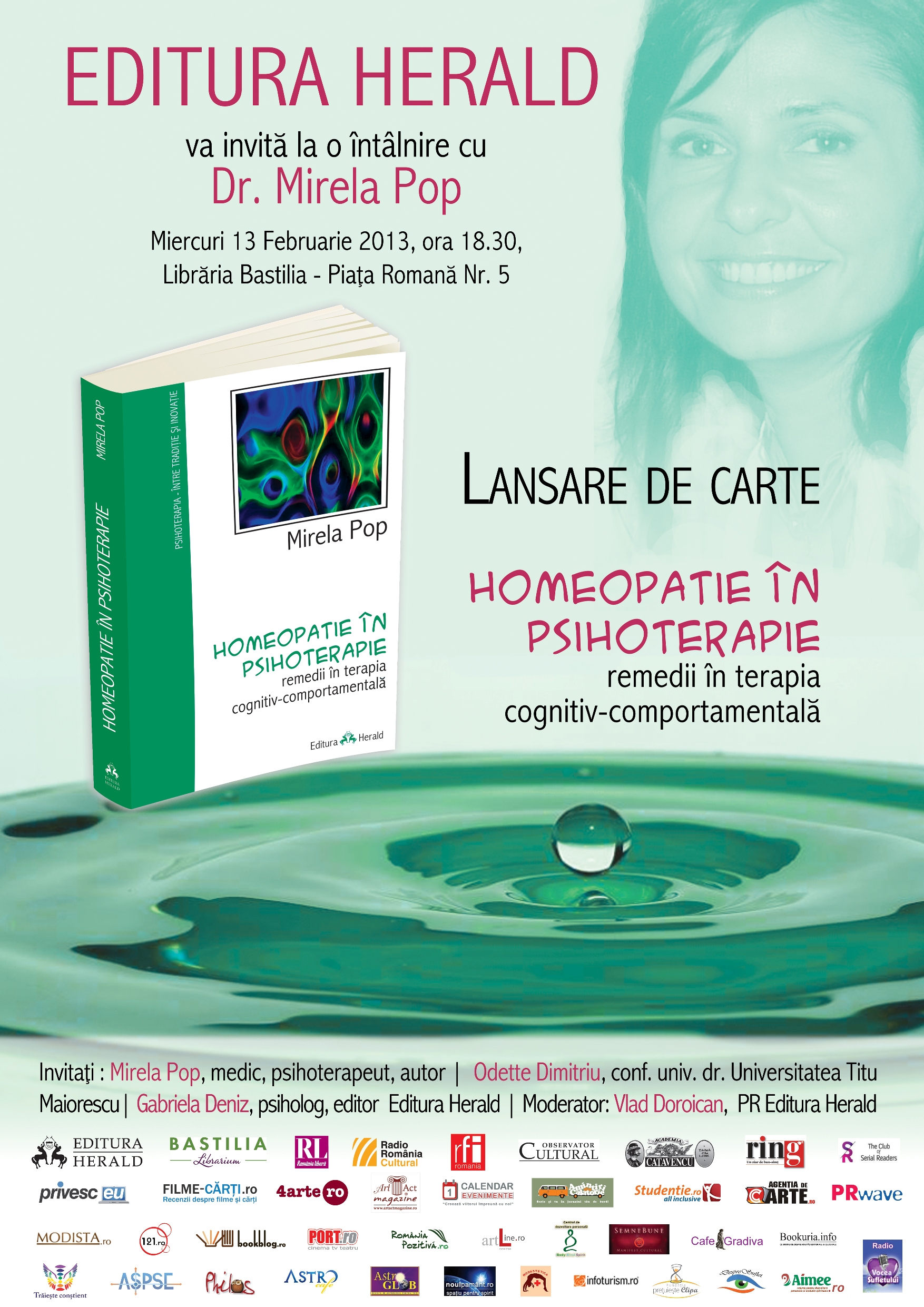 EDITURA HERALD vă invită la o întâlnire între psihoterapie şi homeopatie cu Dr. Mirela Pop - Lansare de carte - Miercuri 13 Februarie 2013, ora 18.30, Librăria Bastilia Editura Herald vă invită la o întâlnire deosebită între psihoterapie şi homeopatie cu Dr. Mirela Pop în ziua de Miercuri 13 Februarie 2013, ora 18.30, la Librăria […]