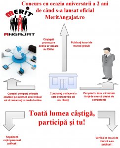 SC Merita Citit SRL lanseaza un concurs ale carui premii constau in trei vouchere de cate 372 lei. Faceti-va publice anunturile pentru locurile de munca vacante si intrati in concurs! Societatile care ofera locuri de munca si le publica pe site intra automat in concurs. Castigatorii vor fi alesi prin tragere la sorti, urmand a […]