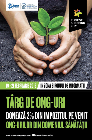Din dorinta de a implica si impulsiona comunitatea locala in directionarea celor 2% din impozitul pe venit catre ONG-urile din domeniul sanatatii, ce sustin cauze cunoscute si de suflet, Ploiesti Shopping City, in parteneriat cu Asociatia Diabeticilor din Prahova si AEGEE Ploiesti, organizeaza Targul de ONG-uri. Acesta are loc in perioada 19 - 21 februarie si se va desfasura in zona biroului de informatii, fiind deschis publicului vineri, intre orele 14:00-19:00 si sambata si duminica intre orele 11:00-19:00.