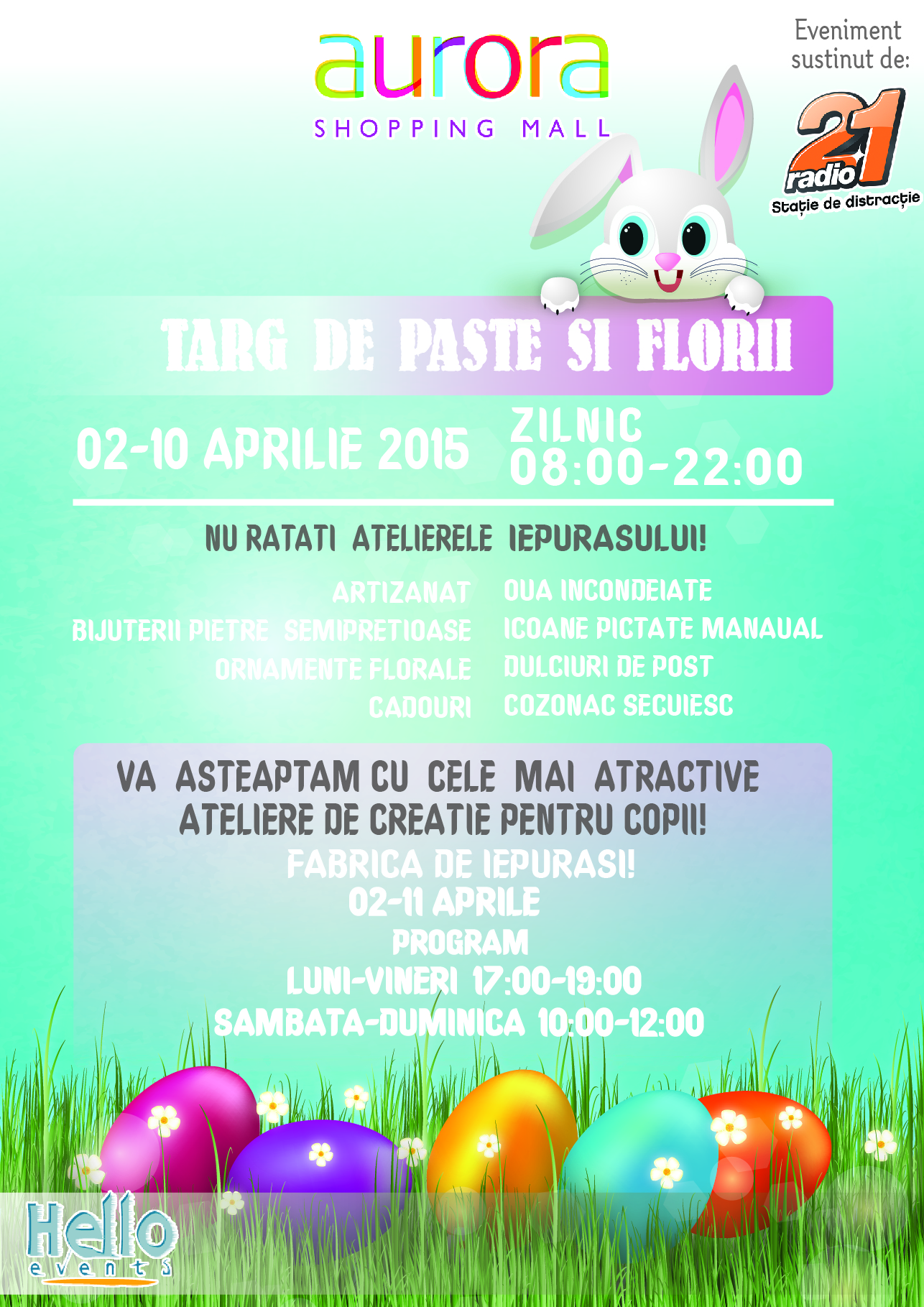 Aurora Mall si Hello Events va invita la “Targul de Paste si Florii” in perioada 02- 10 Aprilie, zilnic in intervalul orar 08.00 - 22.00.