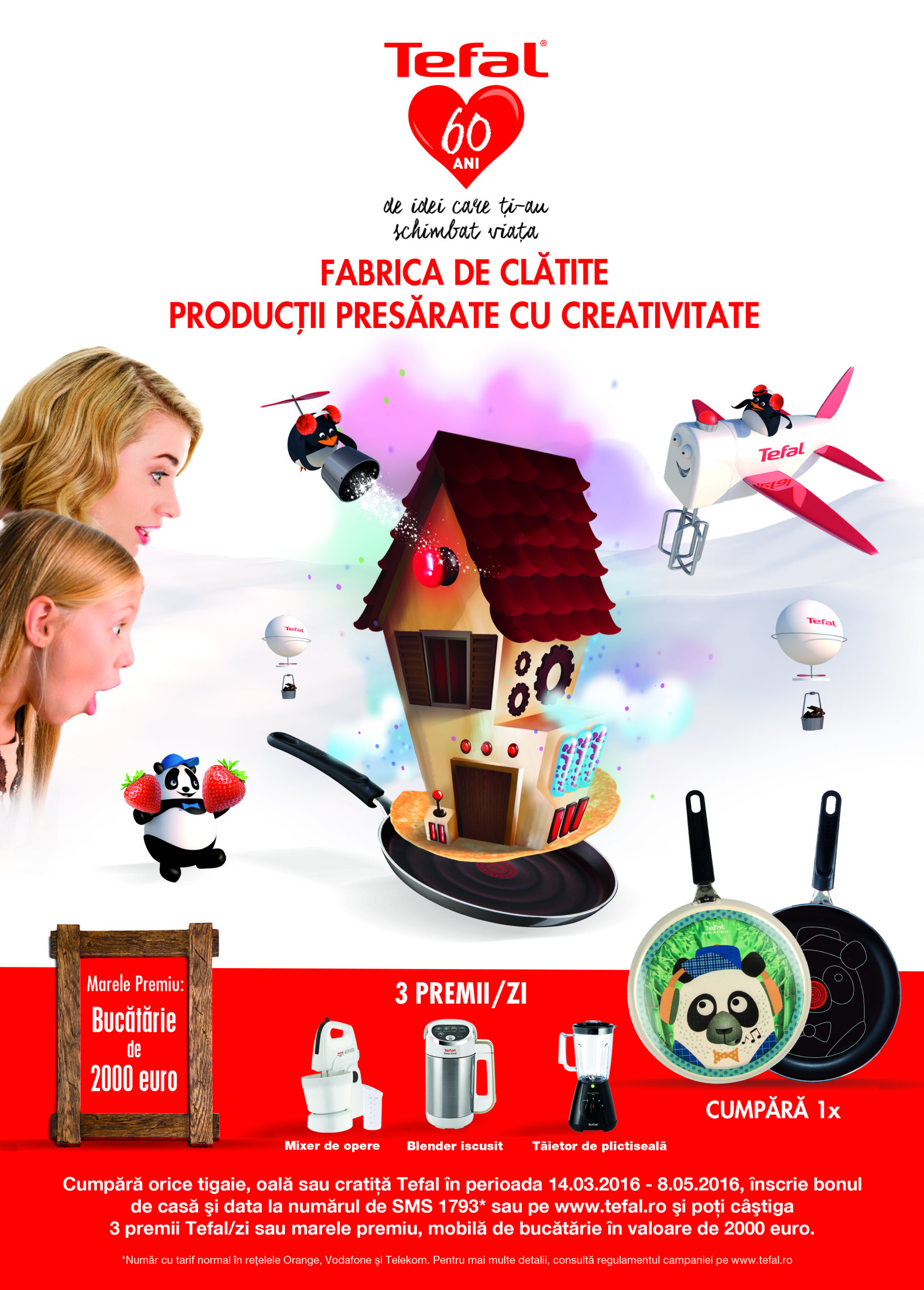 Campania națională „Fabrica de Clătite Tefal – producții presărate cu creativitate” se desfășoară între 14 martie și 8 mai; în această perioadă, cei care achiziționează orice tigaie, cratiță sau oală Tefal, și înscriu bonul și data prin SMS sau pe site-ul Tefal, pot câștiga unul dintre cele trei premii zilnice sau marele premiu: o bucătărie în valoare de 2.000 euro.