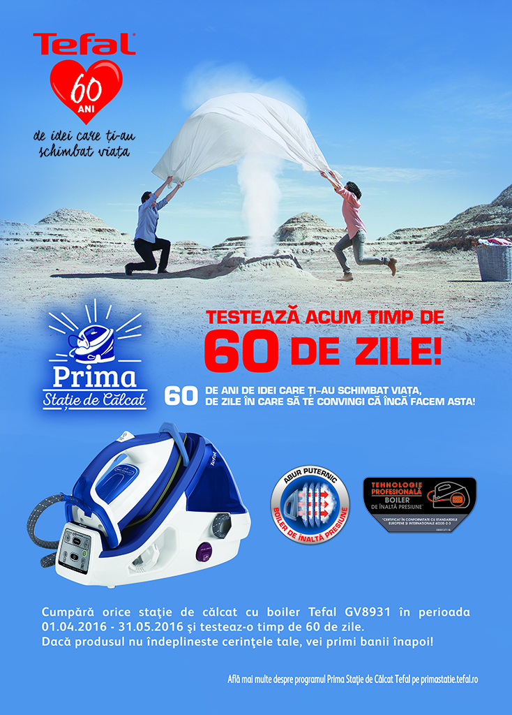 În 2016 Tefal a împlinit 60 de ani de când schimbă viața oamenilor prin tehnologie. Și pentru că ne respectăm promisiunea pe care am făcut-o acum 60 de ani, le oferim clienților noștri 60 de zile de testare pentru stațiile de călcat cu boiler de înaltă presiune”, explică Gabriela Velicu, Trade Marketing Manager, Groupe SEB România.