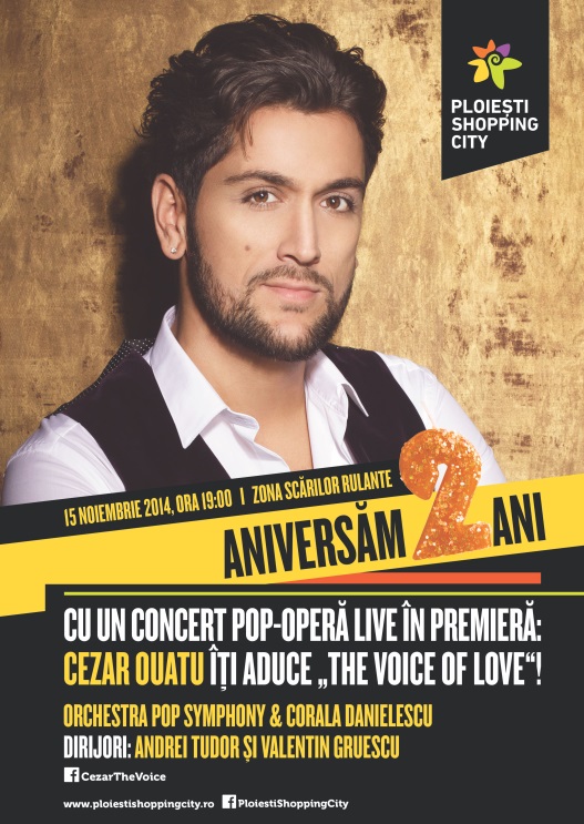 Pentru că ocaziile speciale merită sărbătorite cu fast, Ploiești Shopping City își va răsfăța clienții cu un moment de amploare. Cunoscutul cântăreț Cezar Ouatu va fi solistul unui eveniment unic în România: primul concert pop-opera dintr-un centru comercial din țară. Pe 15 noiembrie, începând cu ora 19:00, artistul va interpreta melodii de pe albumul ”The Voice of Love” și va fi acompaniat de 20 de coriști, 12 instrumentiști din POP SYMPHONY ORCHESTRA & CORALA DANIELESCU și de către dirijorii Andrei Tudor și Valentin Gruescu.