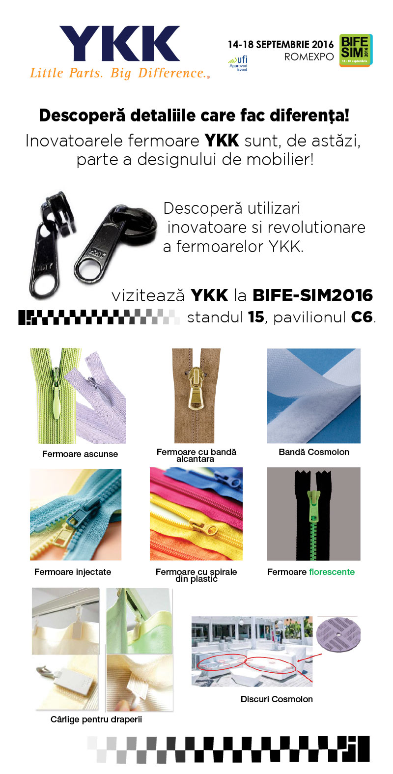 Cunoscutul producător mondial de fermoare YKK va participa în premieră la ediția din acest an a BIFE-SIM. Cu acest prilej vizitatorii și expozanții au ocazia sa descopere utilizări inovatoare și revolutionare a fermoarelor YKK.