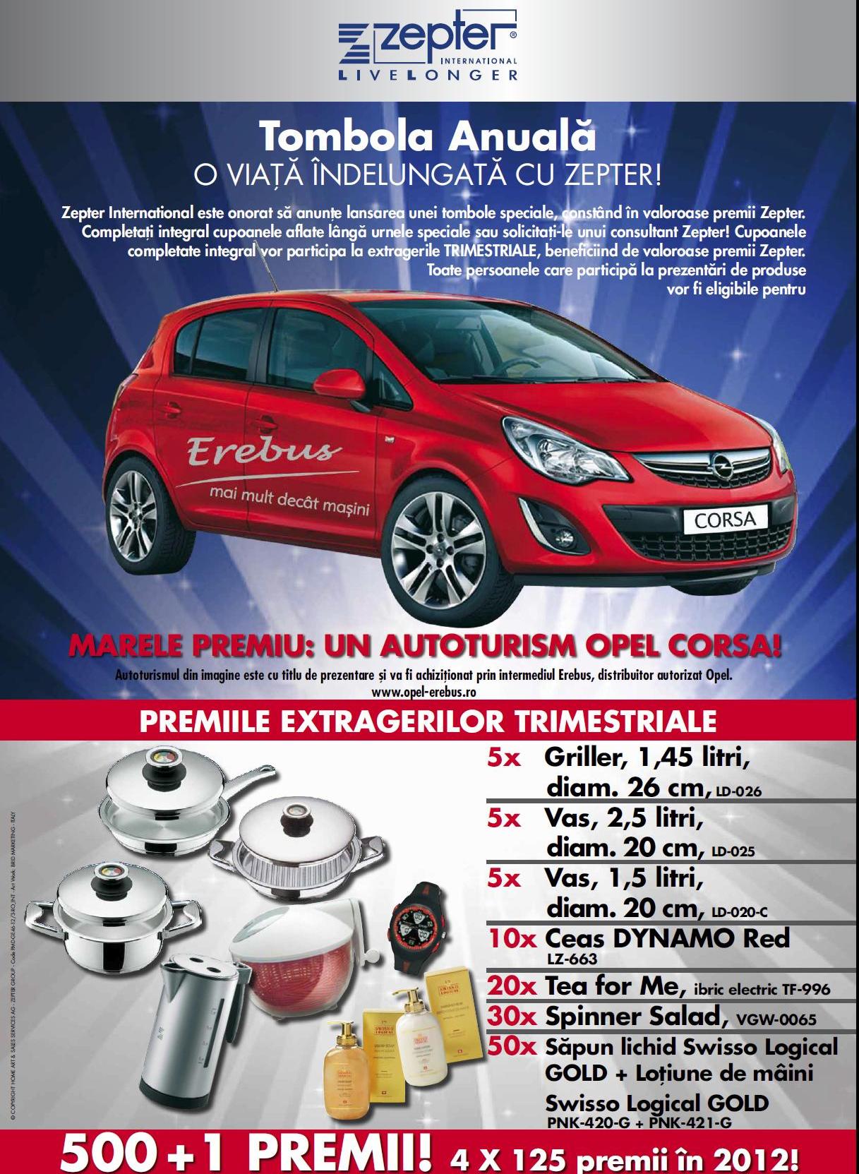 Anul 2012 a oferit tuturor doritorilor posibilitatea câştigării a 500 de premii Zepter, premii constând în produse de înaltă calitate, ce se bucură de aprecierea a peste 80 milioane de clienţi din întreaga lume. Printre cele mai îndrăgite produse Zepter, oferite în cadrul acestei loterii, se numără: vase de gătit, ceasuri, produse cosmetice şi nu numai. Pentru că Zepter oferă întotdeauna mai mult, cei ce au optat pentru o prezentare de produs s-au clasificat pentru extragerea Marelui Premiu, un autoturism Opel Corsa.